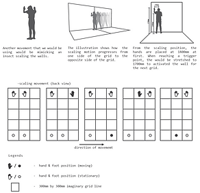 Gregor must make a descend from 3rd level to 1st level from the 9-grid model. Using similar movements like an insect and some human ergonomics, Gregor will be required to crawl, walk and climb his way through his descend. The 9-grid model represents his difficulties and the journey that we have pathed out for him shows how he tries overcomes them. As Gregor reaches toward the end, he begins to lose all hopes of escaping, thus we show the end of his journey with him experiencing a slow and painful death.